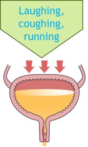 Involuntary loss of urine during physical activities that put pressure on the bladder, such as coughing, laughing, or running.